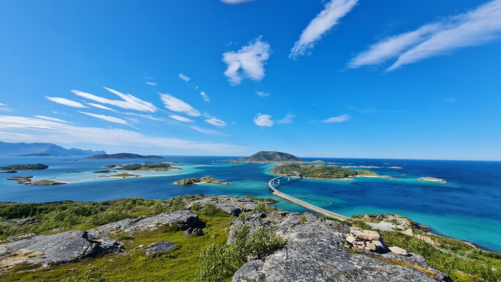 Otočje Lofoti, na severu Norveške, pa so znani po dramatični pokrajini s številnimi vrhovi, ki se kakor zid dvigajo v nebo in ponujajo dronovske razglede na številna otočja poseljena z ribiškimi vasmi. Peščene plaže, turkizno morje in polnočno sonce nikogar ne pustijo ravnodušnega.