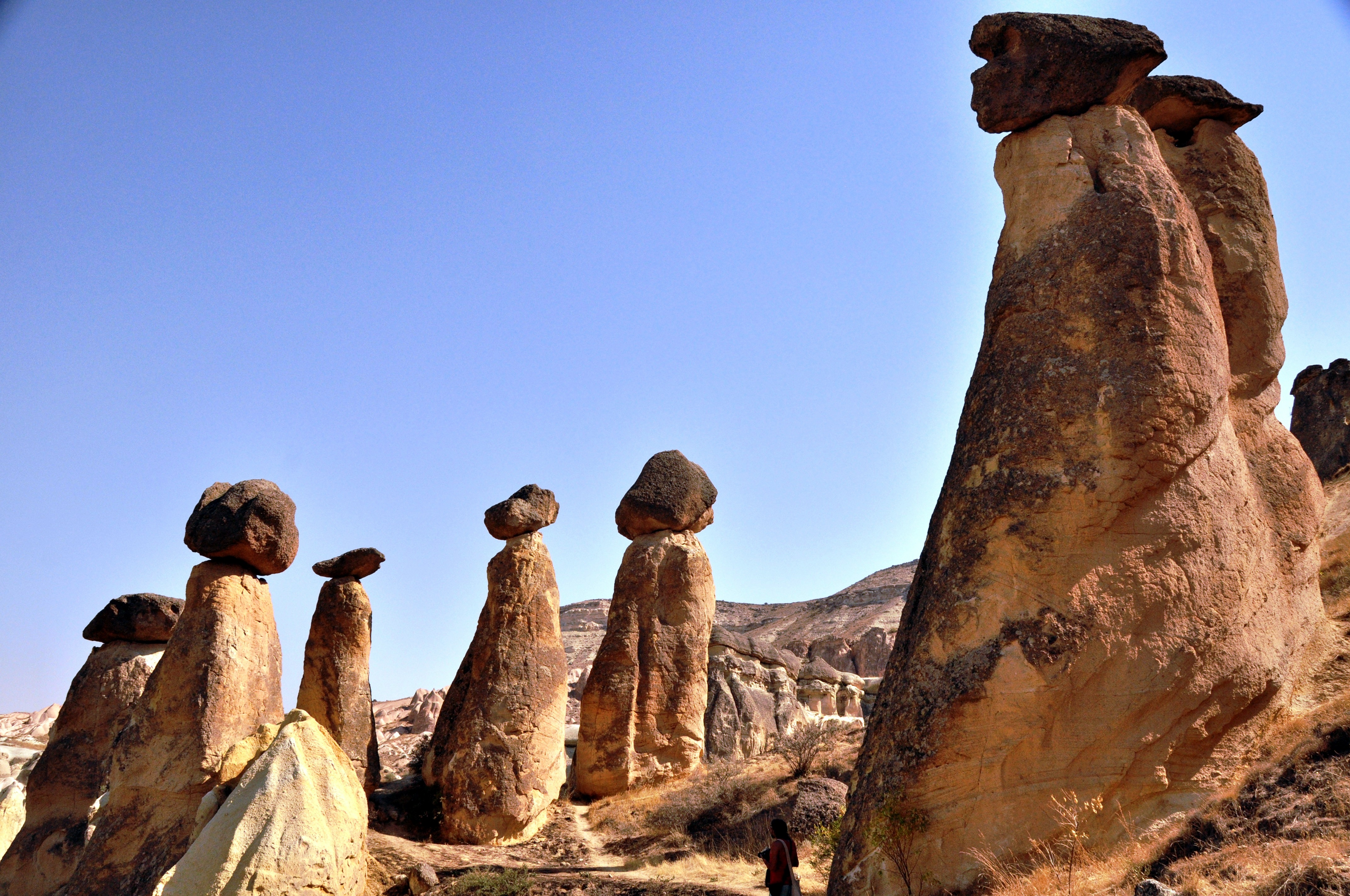 Na koncu še proti Kapadokiji. Tam tudi na gorskem kolesu raziskujemo mesečevo deželo, polno kamnin nenavadnih barv in oblik ter človeških bivališč izklesanih vanje. Odpravimo se do zelene soteske Ihlare kjer se skrivajo zgodnjekrščanski samostani ter pokukamo v velikansko podzemno mesto, kjer se je nekoč skrivalo več tisoč kristjanov. Skupaj obiščemo še tipični turški hamam. Opcija je tudi prelet z balonom (res hudo!) in quadbajking.